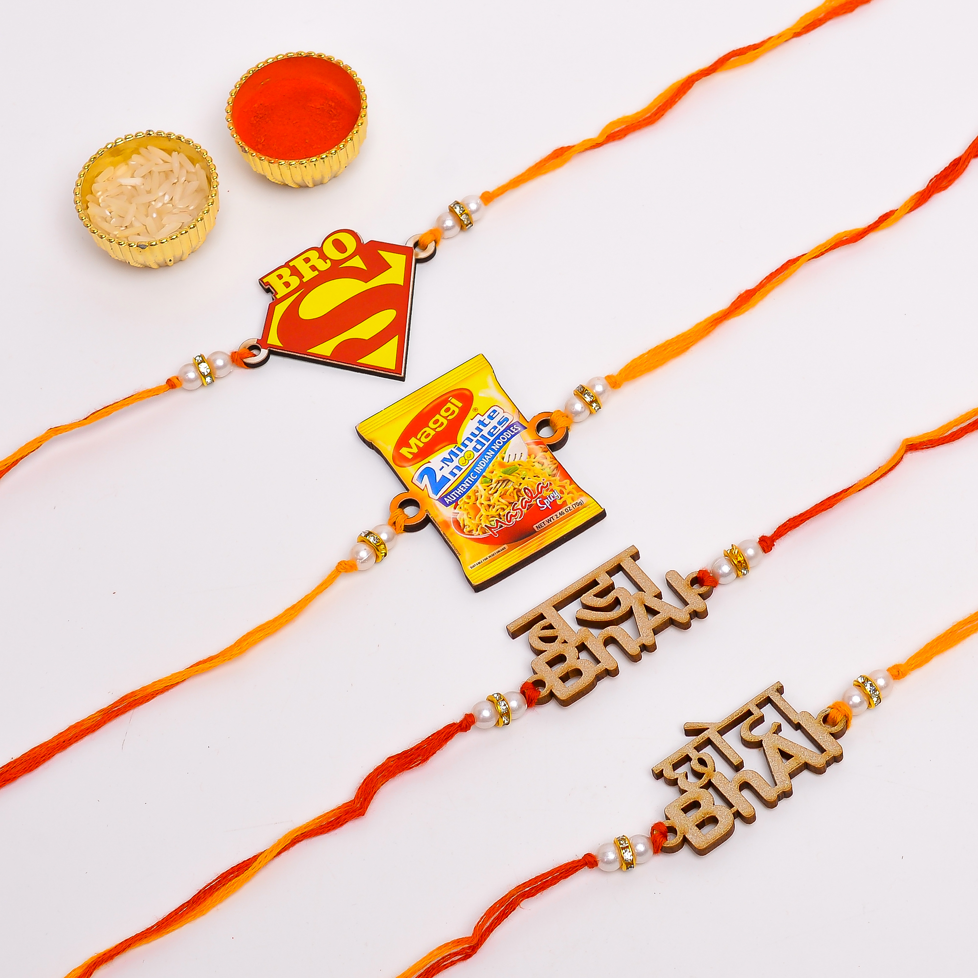 Amazing Gold Color Swag, Single Wala, Caring Wala Wooden Rakhi with Roli Chawal For lovely Brother Set Of 4-WS-R-5A